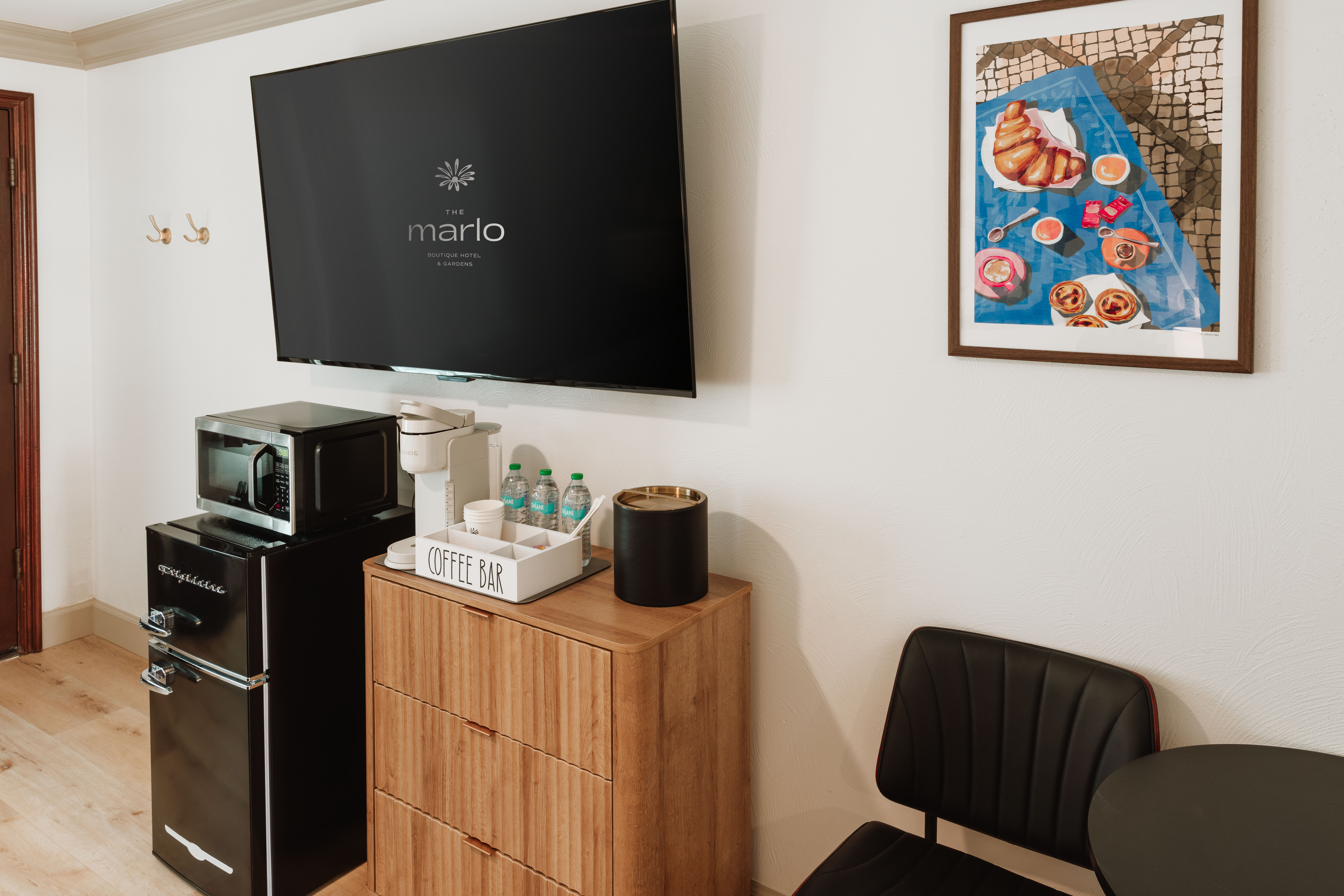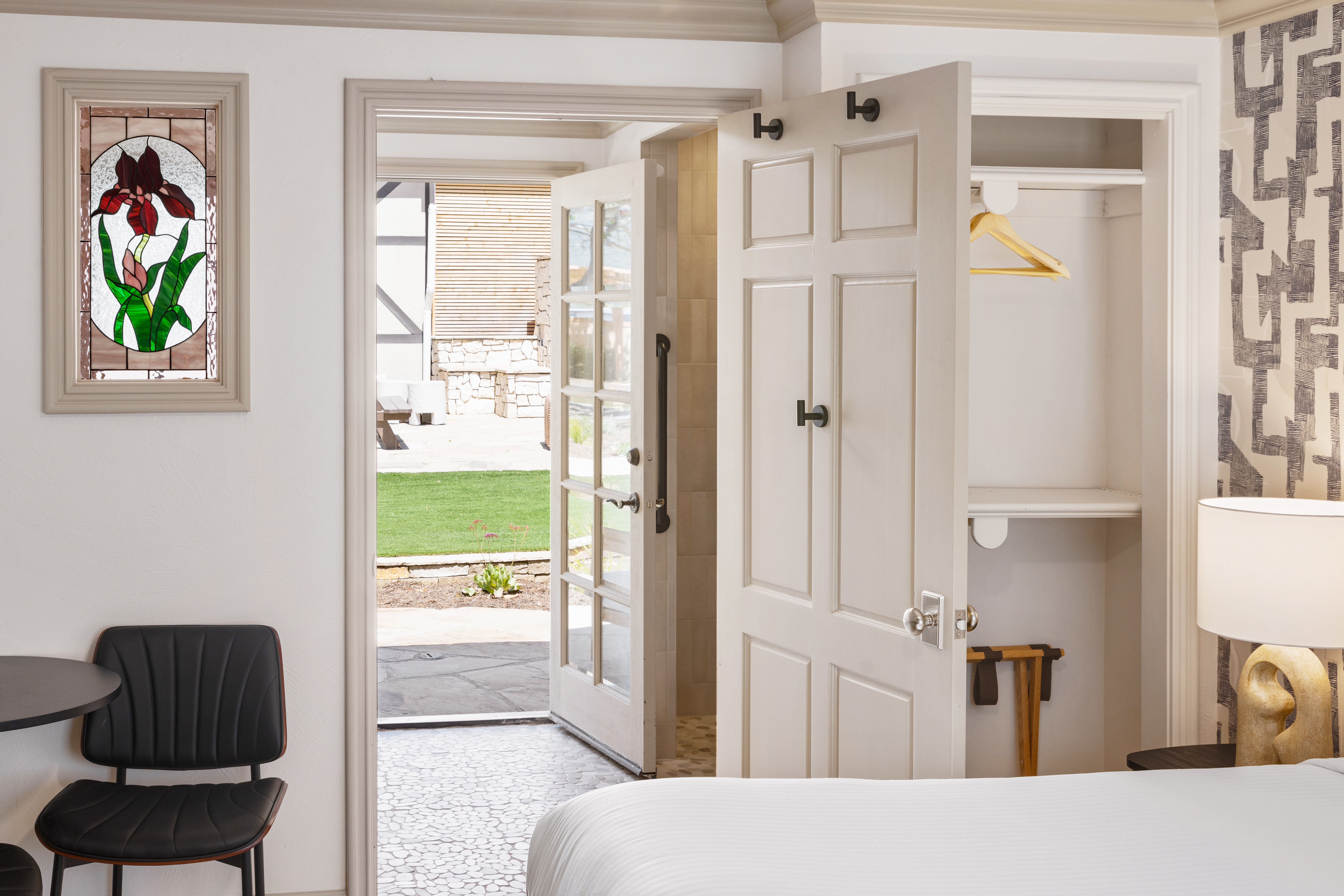 We have one accessible room — a newly designed King room with warm Danish-Californian decor and thoughtful touches for a comfortable stay. It includes a microwave, mini fridge, and a back door that opens to the peaceful garden, where a gazebo and fireplace offer a perfect spot to relax.
